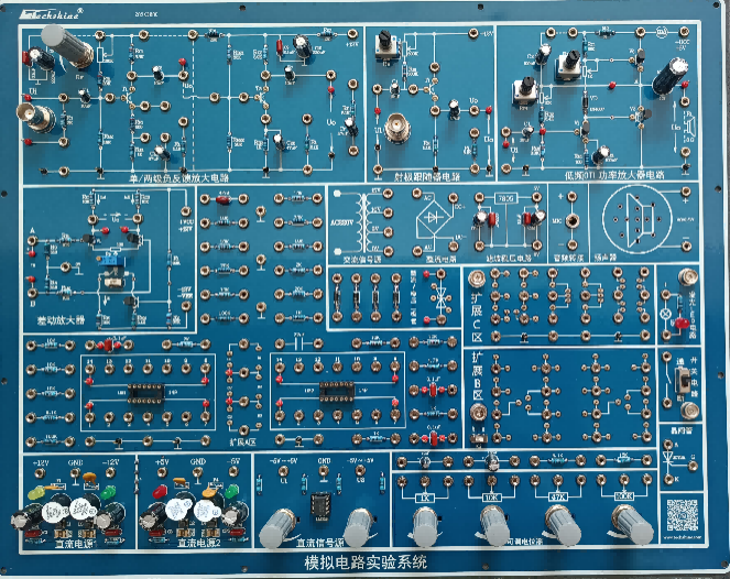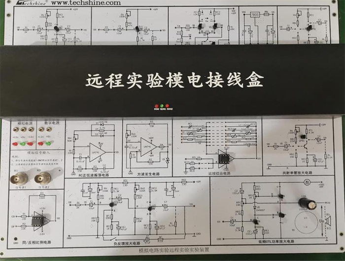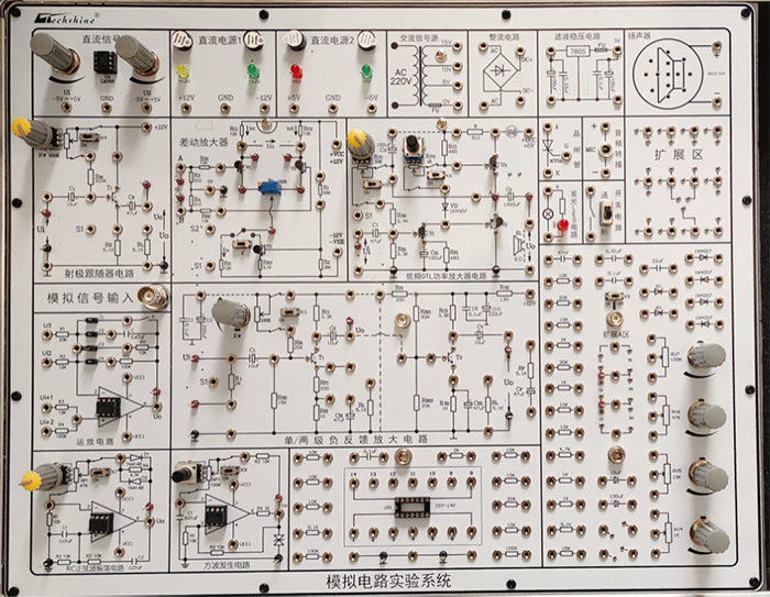 包含:共射单管放大电路模块,射极跟随器电路模块,差动放大器模块,滤波稳压电路模块,场效应管放大电路模块,RC正弦波振荡模块,方波发生电路模块,运放综合电路模块,负反馈放大电路模块,低频OTL功率放大电路模块,同/反向比例电路模块,模拟信号输入模块,远程电位器模块,所有模电实验可调电位器均采用线性电位器
